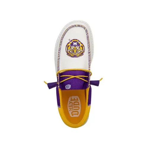 The Men's Wally Tri now screams school spirit! Show your support for the LSU Tigers in style with a unique design featuring the iconic logo and bold team colors. Made with signature HEYDUDE™ comfort, lightweight materials, and a slip-on design, these are perfect for all-day wear to bring you and your crew from the tailgate to the game.